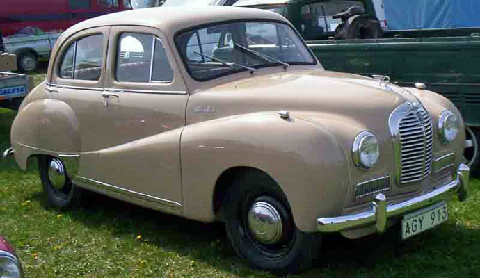 The Austin A40 Somerset was launched in 1951 and had a short production run of just two years. It was similar in appearance to the smaller A30 saloon car, but was built on a separate chassis unlike the A30 which was Austin's first unitary construction car. A convertible model known as the drop-head coupe (pictured) was also produced, but very few survive. All models had leather upholstery. The four cylinder engine was the same unit that was used in the earlier Austin Devon models, but some improvements had been made to up the power output of it. Another version of this car was the Countryman estate and this continued in production until 1957.